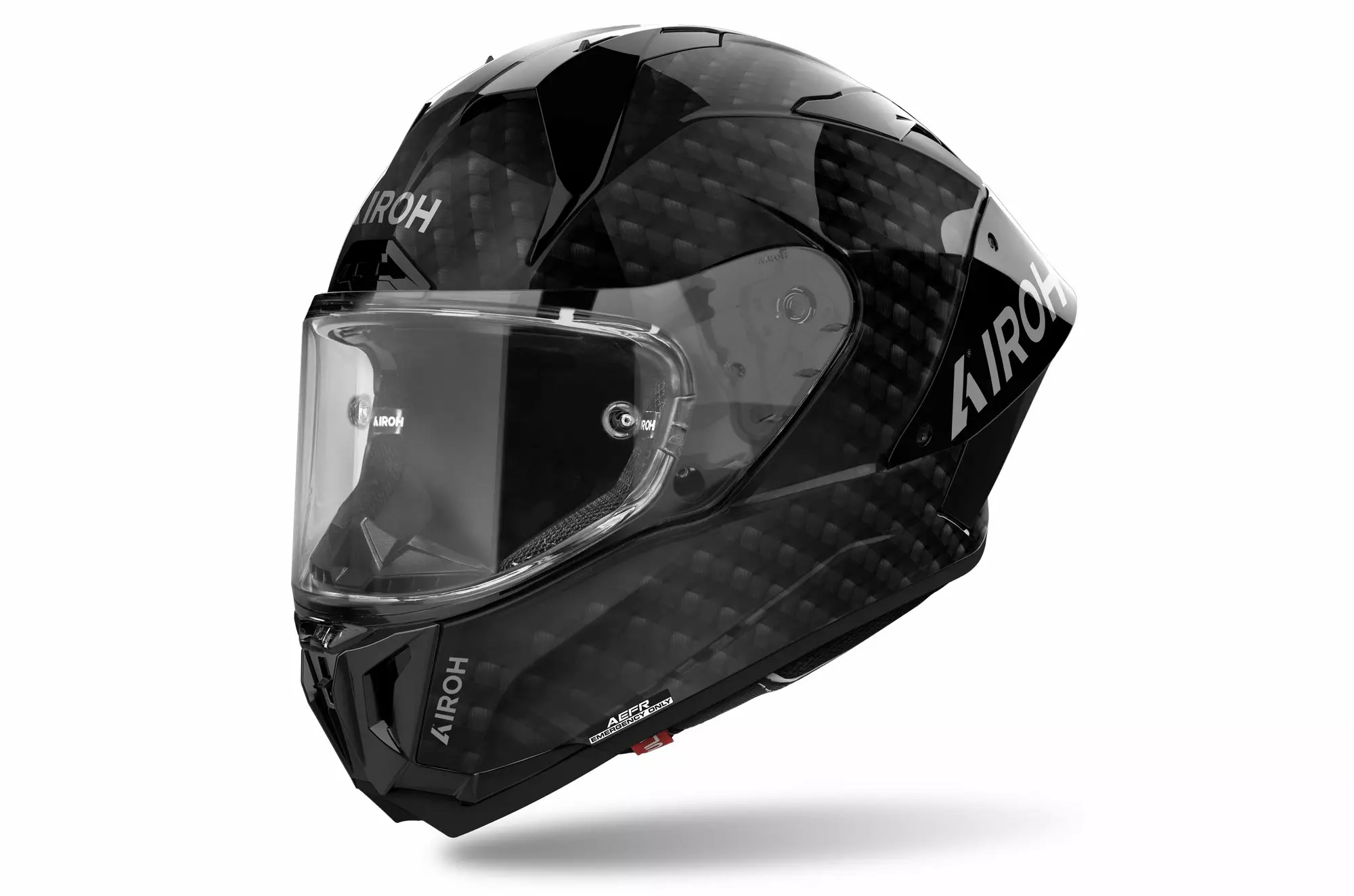 Visir: 2d racingvisir, ATVR (Airoh Tool-less Visor Removal), låsningssystem racing, rep- och UV-beständigt, A3S (Airoh Automatic Antifog System), tear off redo, extra bred synfält