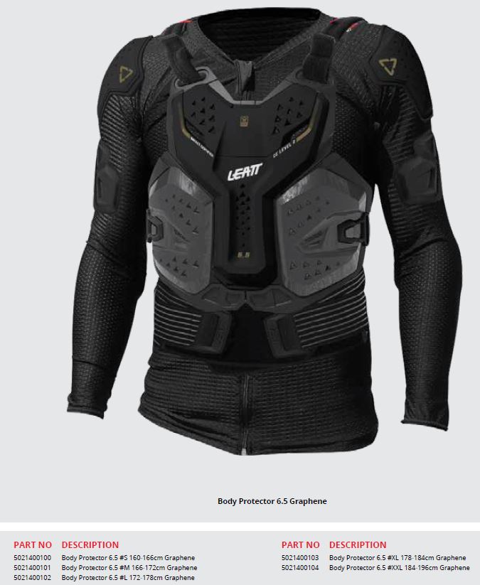 Det hårda skalet 6.5 Kroppsskydd är en ny produkt och koncept för 2021, det kommer i 2 delar, det finns en compression dräkt med dragkedja med inbyggda axel- och armbågsskydd samt höjdjusterbart njurbälte. Sedan används ett fullt hardshell CE -certifierat bröst- och ryggskydd tillsammans med sidoskydd på toppen. Detta modulsystem ger dig inte bara mest skydd utan också bra ventilation och komfort. Det här nya konceptet är väldigt lätt att ta av och på, vilket är en lättnad efter en heldags ridning och gör rengöring superenkelt, fungerar med eller utan Leatt Neck Brace. Om du letar efter det ultimata inom överkroppsskyddet behöver du inte leta längre.