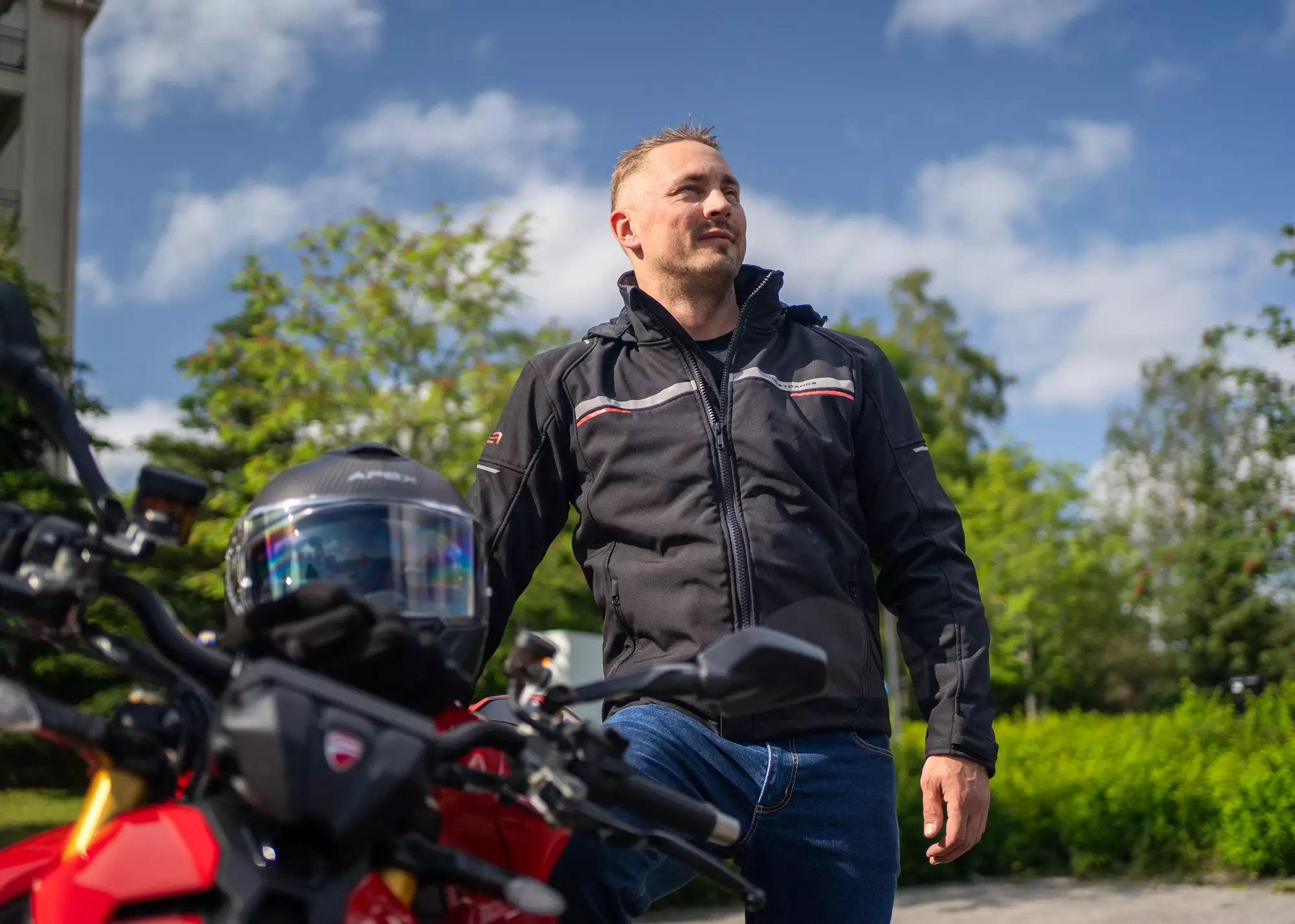 Lätt softshell-jacka med avtagbar huva, tillverkad av vind- och vattentätt material. Jackan har bekväma, CE-certifierade nivå 2-skydd vid axlar och armbågar, två ytterfickor och en innerficka med dragkedja. Jackan kan även kompletteras med ryggskydd.