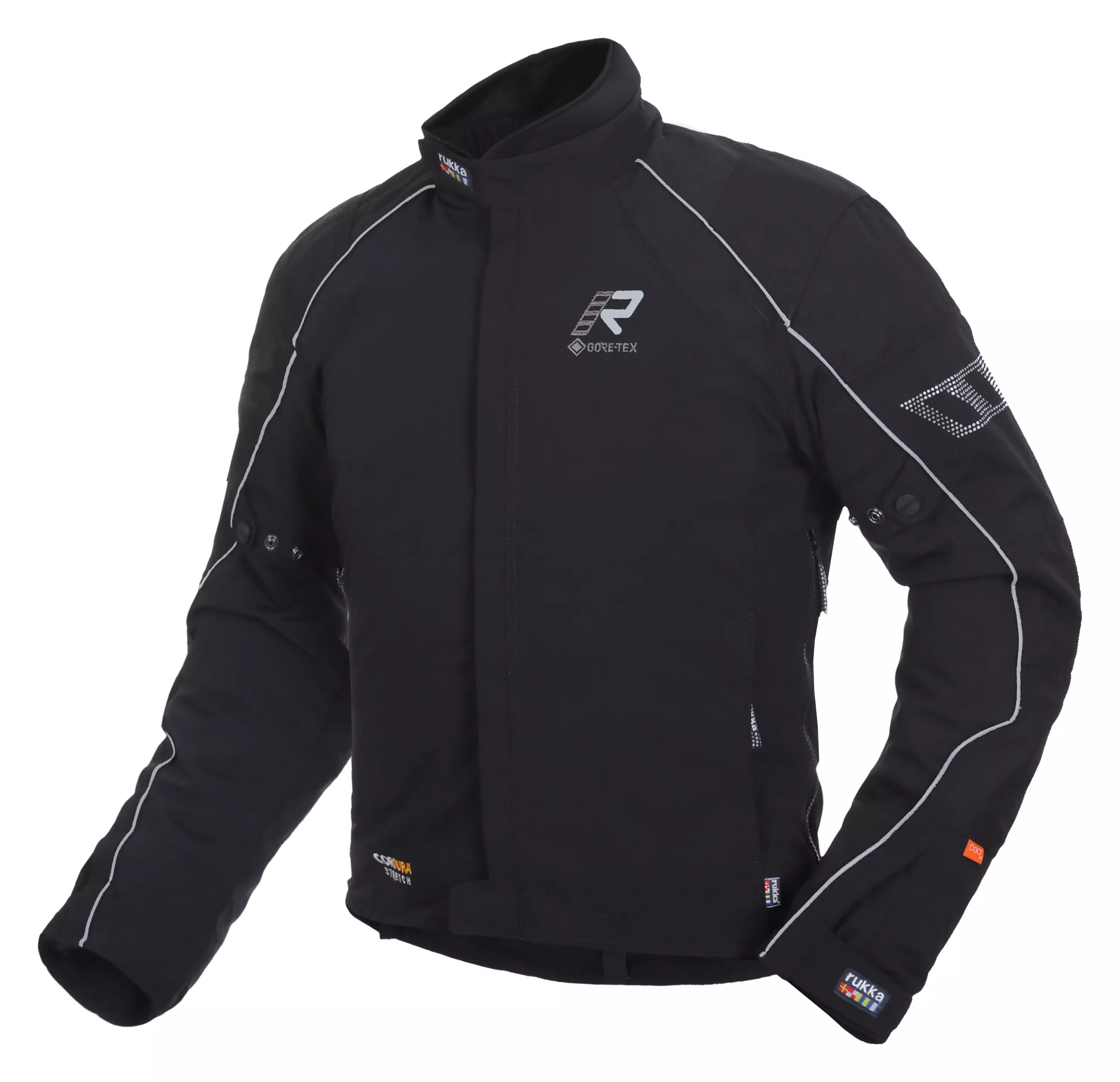 Rukka Allroads motorcykeljacka för män. Löstagbart termofoder (60 g). Mjuk neopren i kragen. Integrerad skyddande ATS (=fäst stormkrage) GORE-TEX stretchkrage, som kan döljas i sin ficka. Breddjustering på överarm med tryckknappar. En grenrem och en lång anslutningsdragkedja för byxor. Justerbar fåll och ärmslut med kardborreåtdragning. 100 % andningsbart, vind- och vattentätt GORE-TEX Z-linermembran under skalmaterialet. Nötningsbeständiga CORDURA® 500D-förstärkningar på axlar och armbågar. Nötningsbeständigt CORDURA® 500D stretchskaltyg. Två vattentäta innerfickor inklusive en mobilficka. Två nedre fickor med dragkedja.