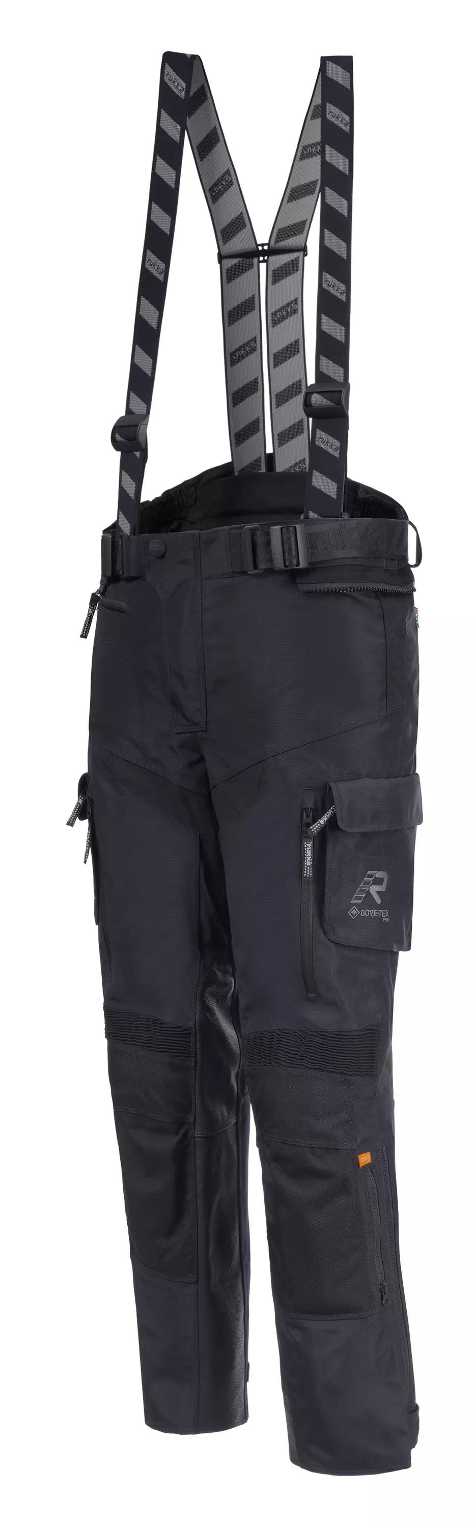 Rukka Adventure motorcykelbyxor för män. Rukka AirCushion-system i sittdelen. Värme- och nötningsbeständiga läderlappar på insidan av knäna och på sittdelen. Stretchpaneler på grenen, insidan av låren, över och bakom knäna och på ryggen. Justerbart midjebälte. Midjestängning med tryckknapp. En lång anslutningsdragkedja för jacka. Justerbara benslut med dragkedjor och kardborreband. Avtagbara Rukka Defence & Comfort-hängslen. 100 % andningsbart, vind- och vattentätt GORE-TEX Pro 3-lagerslaminerat för nötnings- och slitagebeständiga CORDURA® skaltyg. Nötningsbeständiga CORDURA® 1500D-förstärkningar på höfter och knän. En ytterficka med dragkedja. Två vattentäta cargofickor med dragkedja och tryckknappar.